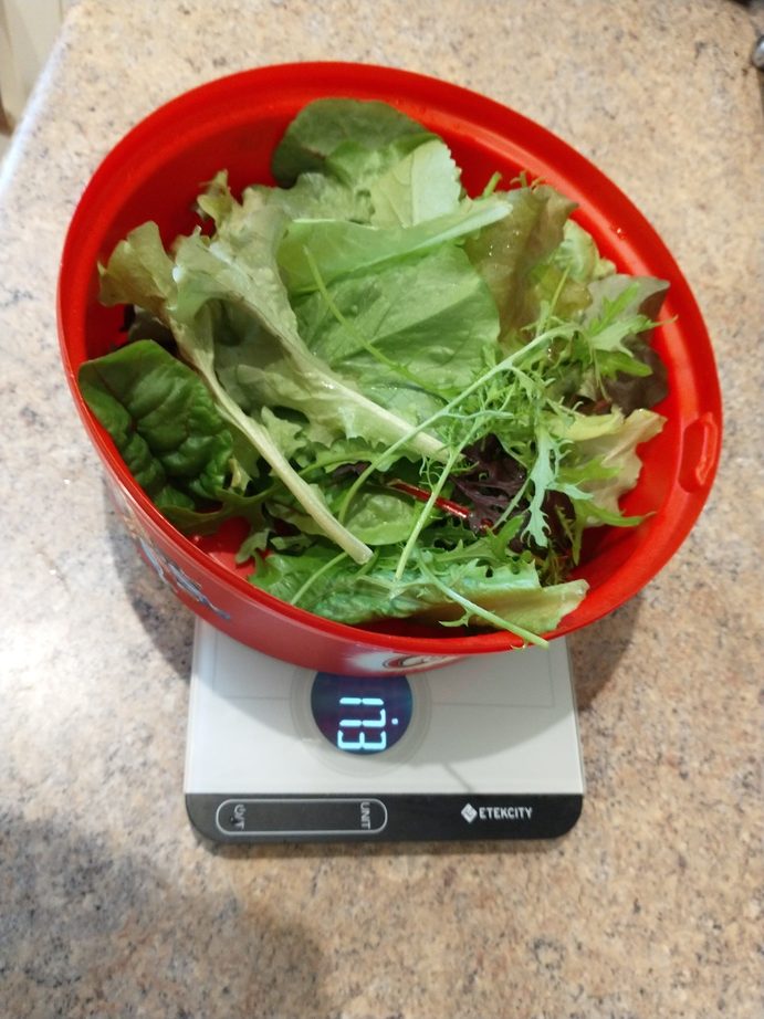 I make that 280g of salad leaves in total — more than twice as much as I harvested last time, which I think will certainly be sufficient to accompany two meals over the next week. I look forward to seeing how the plants get on in terms of producing new leaves during that time.