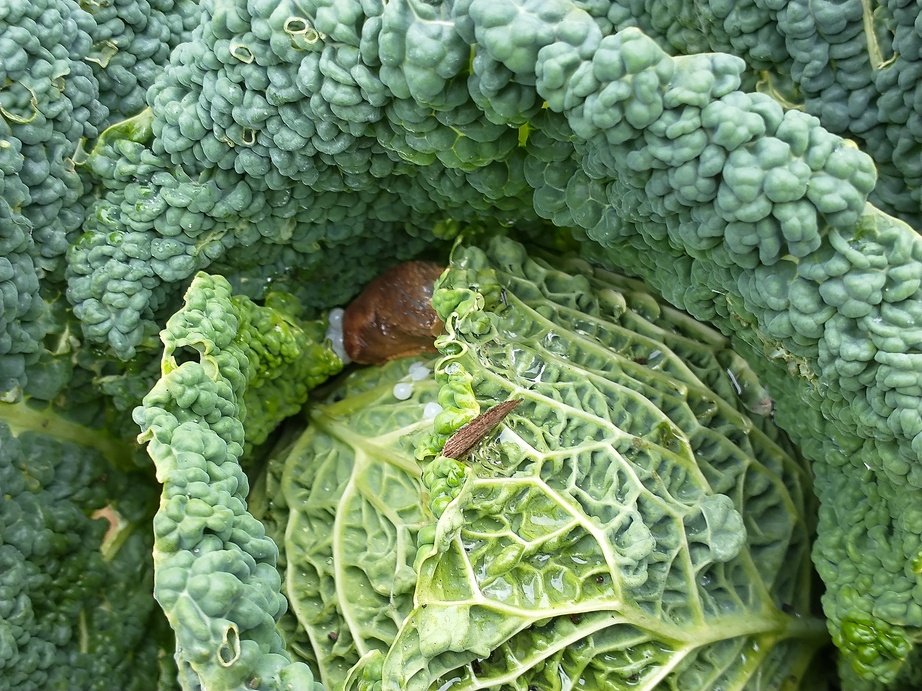 Look at this one I just found! Creeping down inside one of my savoy cabbages and laying a load of eggs 🙁