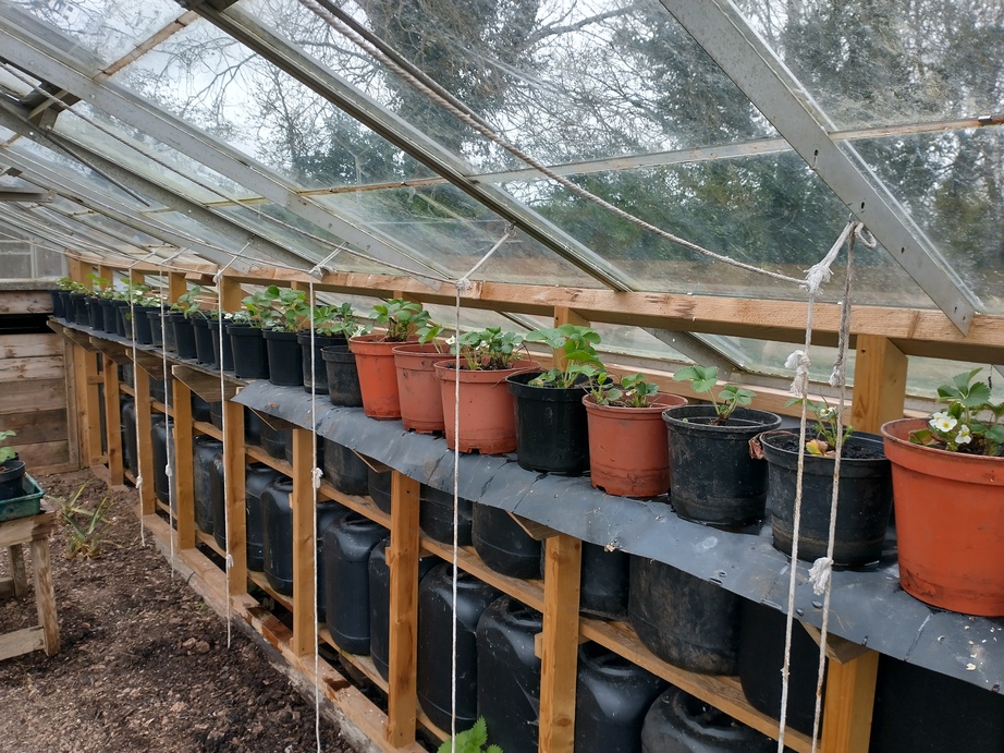 It doesn’t make quite enough space for all the pots of strawberries (I think there was room for twenty-six and I had twenty-nine), but perhaps I can make another shelf for the north-west wall as well as the north-east one.