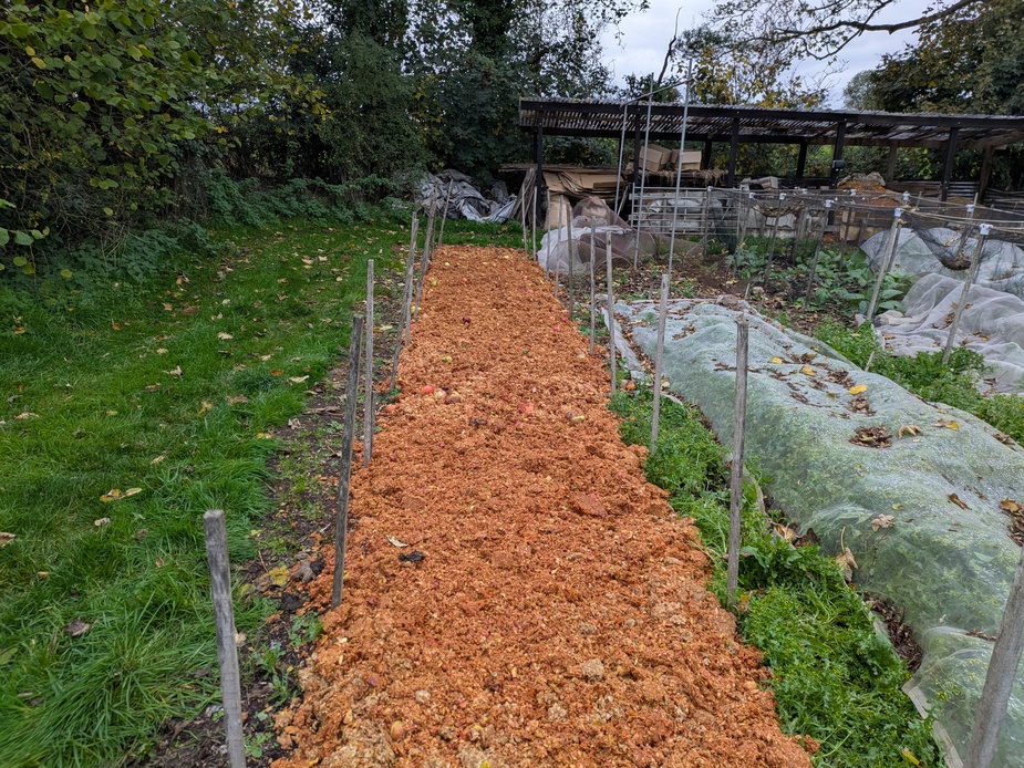 I’ve pressed so many apples this season that I was running out of space to compost the pulp. I estimate that I’ve done seven tonnes of apples and I’m not finished yet, so I just had to start spreading it directly on the vegetable beds. It’s got at least six months before I’ll be wanting to plant anything there. Hopefully that will be sufficient. And it will help to keep down the weeds 😀