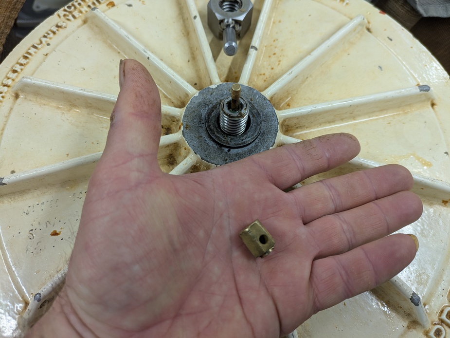 Oh dear! In my hand here is the top half of the bleed valve from the bladder of the press below. It has snapped off inside the rod that supports the bladder, so the actual air release mechanism is still trapped. Given that the broken edges of the brass have turned quite green, I’m not sure the breakage happened recently. I suspect that it cracked some time ago, allowing apple juice in and damaging the valve further.