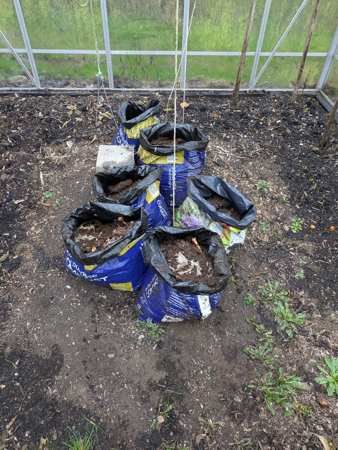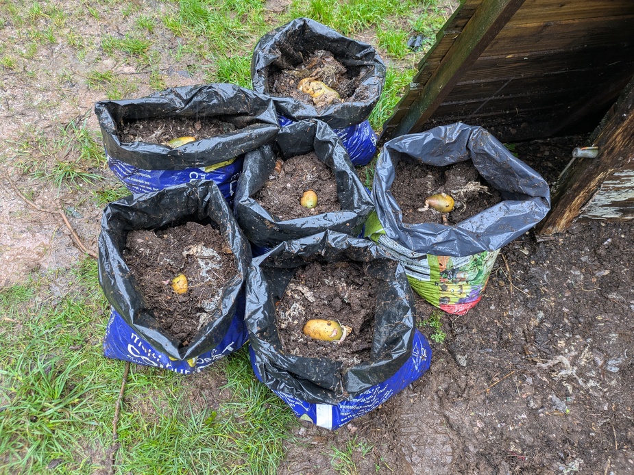 Given the success of my late new potatoes last year, I’m going to try for some very early ones this year. I’ve saved all the inedible green potatoes from last year’s harvest and today, in the torrential rain, filled six compost sacks with the last of my 2024 food waste compost and put one potato in each. They were already starting to shoot, so I didn’t see any reason to chit them.
