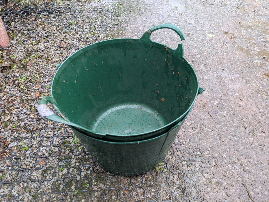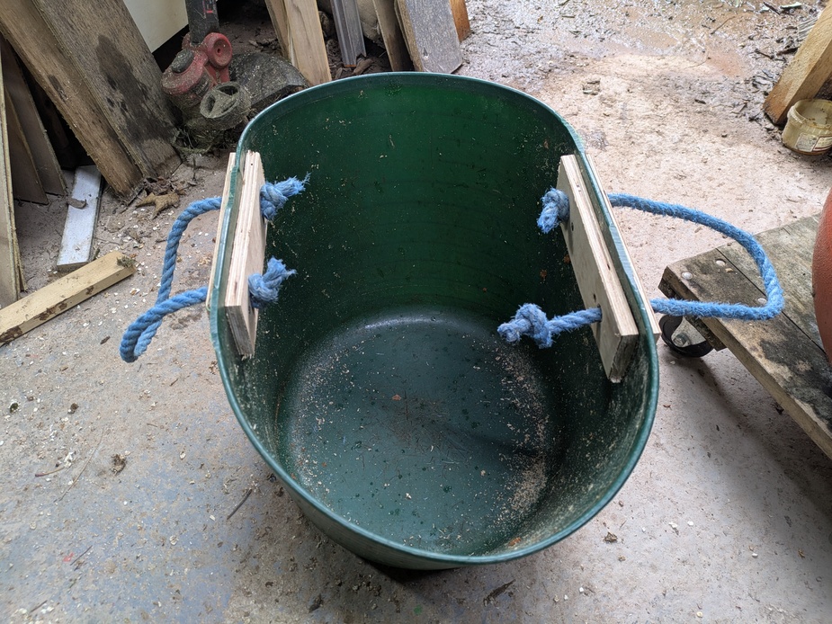 There may be neater ways to do this. Just cutting rings of ply for the reinforcement of the handles, for instance. Or perhaps to splice the rope back into itself to make a loop, avoiding the need for knots at all. I can’t see that doing away with some sort of reinforcement will work though — these are forty litre trugs and when full may be quite heavy.